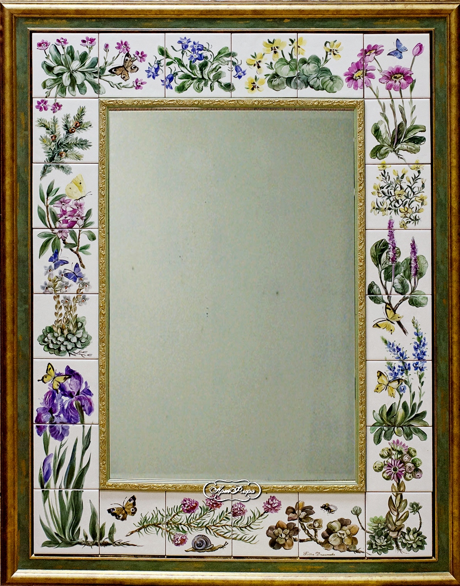 Зеркало "Альпинарий". 70 х 90 см.Надглазурная роспись на керамической плитке.