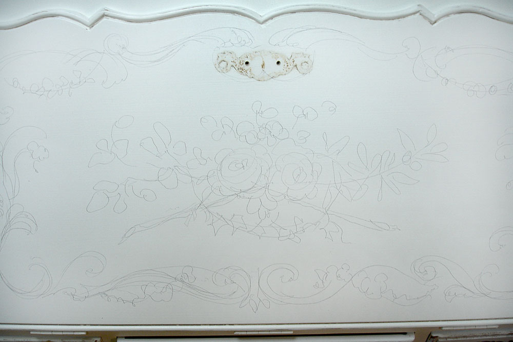 1. Первый этап - нанесение эскизного рисунка на откидную столешницу простым карандашом (все фото кликабельны):