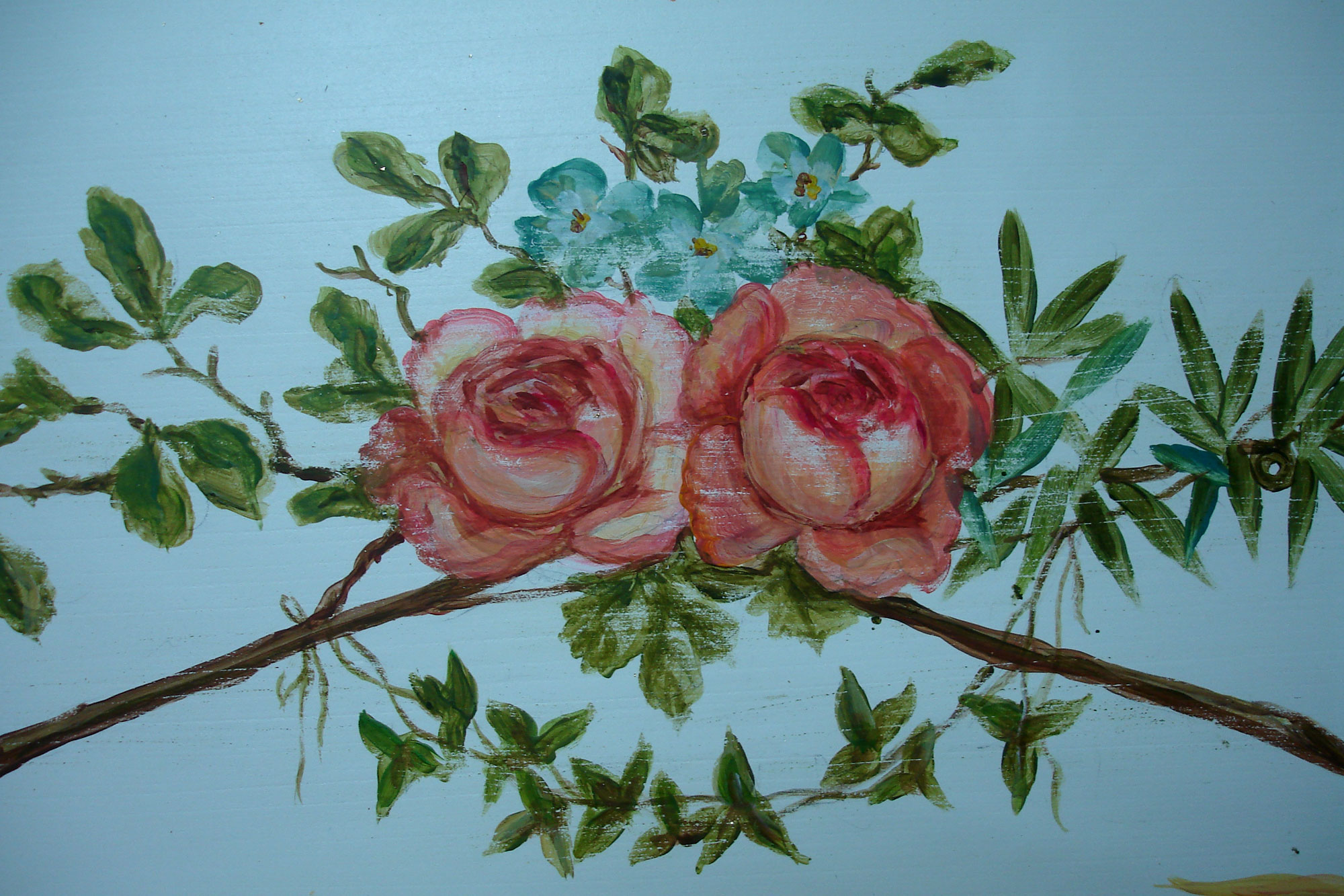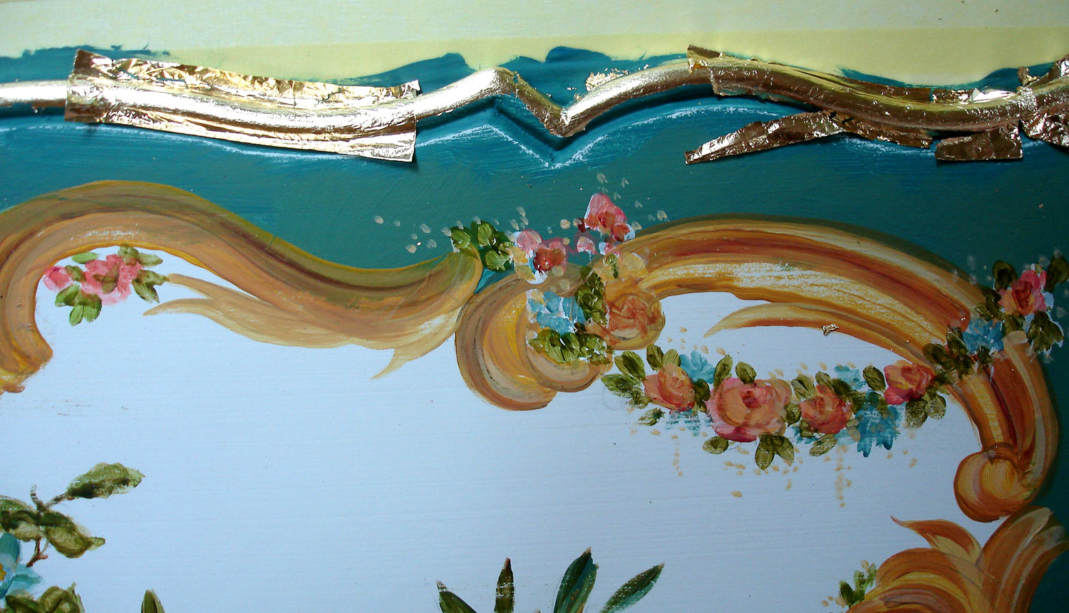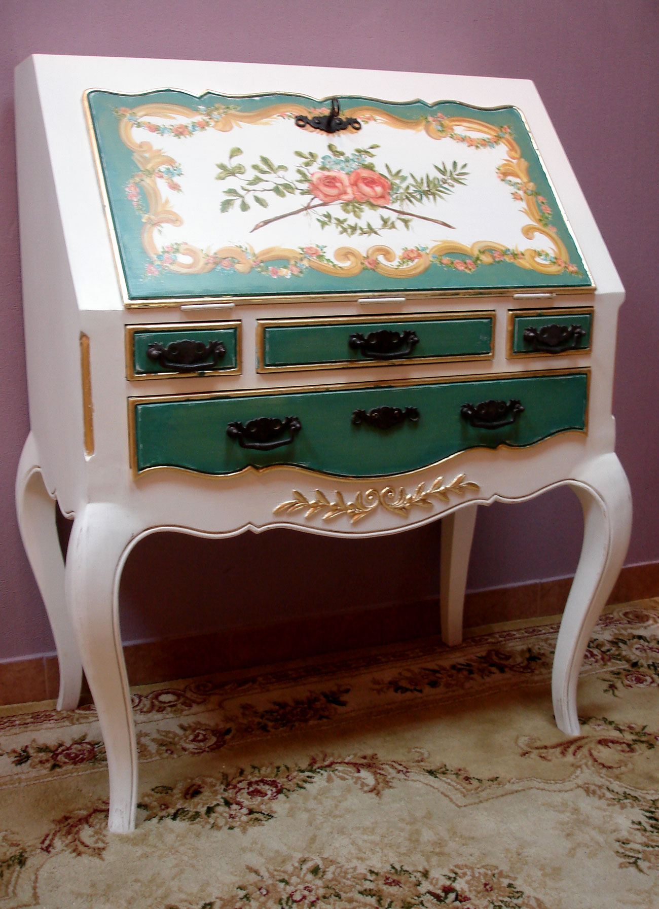 Моя хорошая приятельница и заказчица, обратилась ко мне с просьбой расписать небольшое бюро. При выборе мотива для росписи пришли к общему мнению: показать цветочную деревенскую идиллию в стиле рококо, может с неким юмором - в неряшливом золочении.