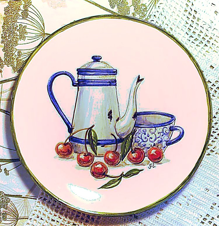 эмалированную посуду, украшенной ягодами и цветами, а ободок тарелочек покрыть зеленым цветом....