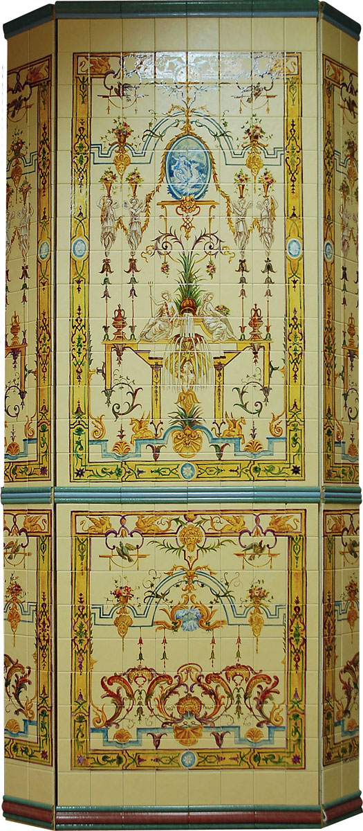 Печь оформлена плиткой по мотивам старинных изразцов французских замков, размер 1200х2200 см, 90 000 руб.