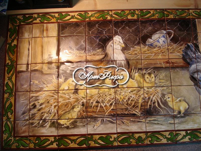Фартук для кухни "На птичьем дворе " № 2. Фрагмент Курица с цыплятами