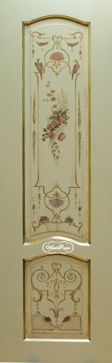 Дверь расписана в барочном стиле. Роспись дверей выдержана в пастельных тонах, применено золочение тонких филенок поталью, старение и патинирование.