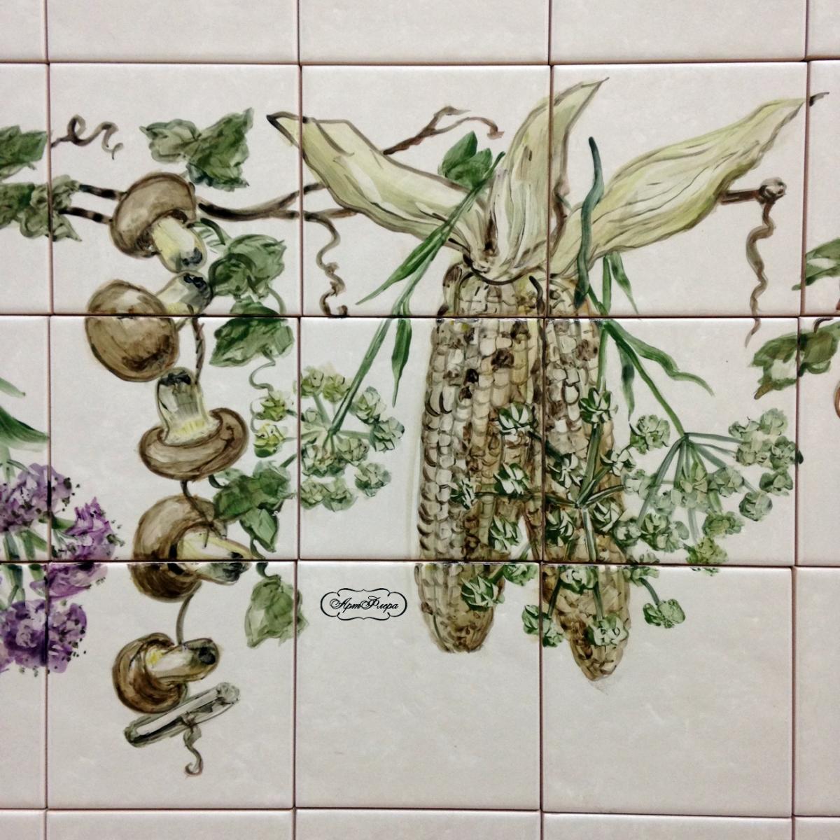 Авторская надглазурная роспись на керамической плитке. Роспись проходит несколько обжигов в муфельной печи при 800С. Таким образом, при такой температуре краски вплавляются в глазурь плитки, и образуется стеклянный сплав. Ухаживать за расписанной плиткой не сложнее, чем за обычным кафелем :мыть, чистить любыми моющимися средствами.