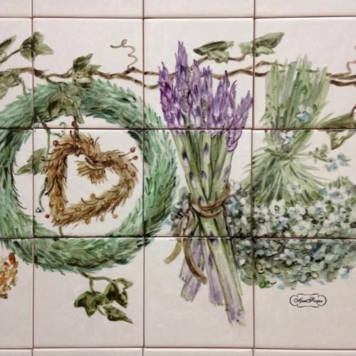 А за тем , только нужные фрагменты , расписала. Таким образом плитка на стене "считывается " единым целым, без переходов .