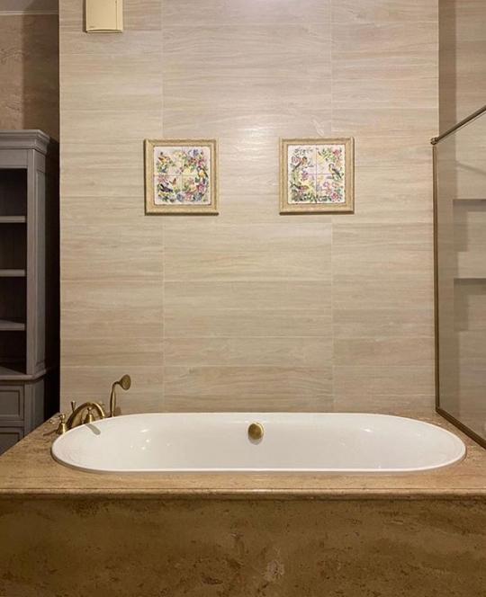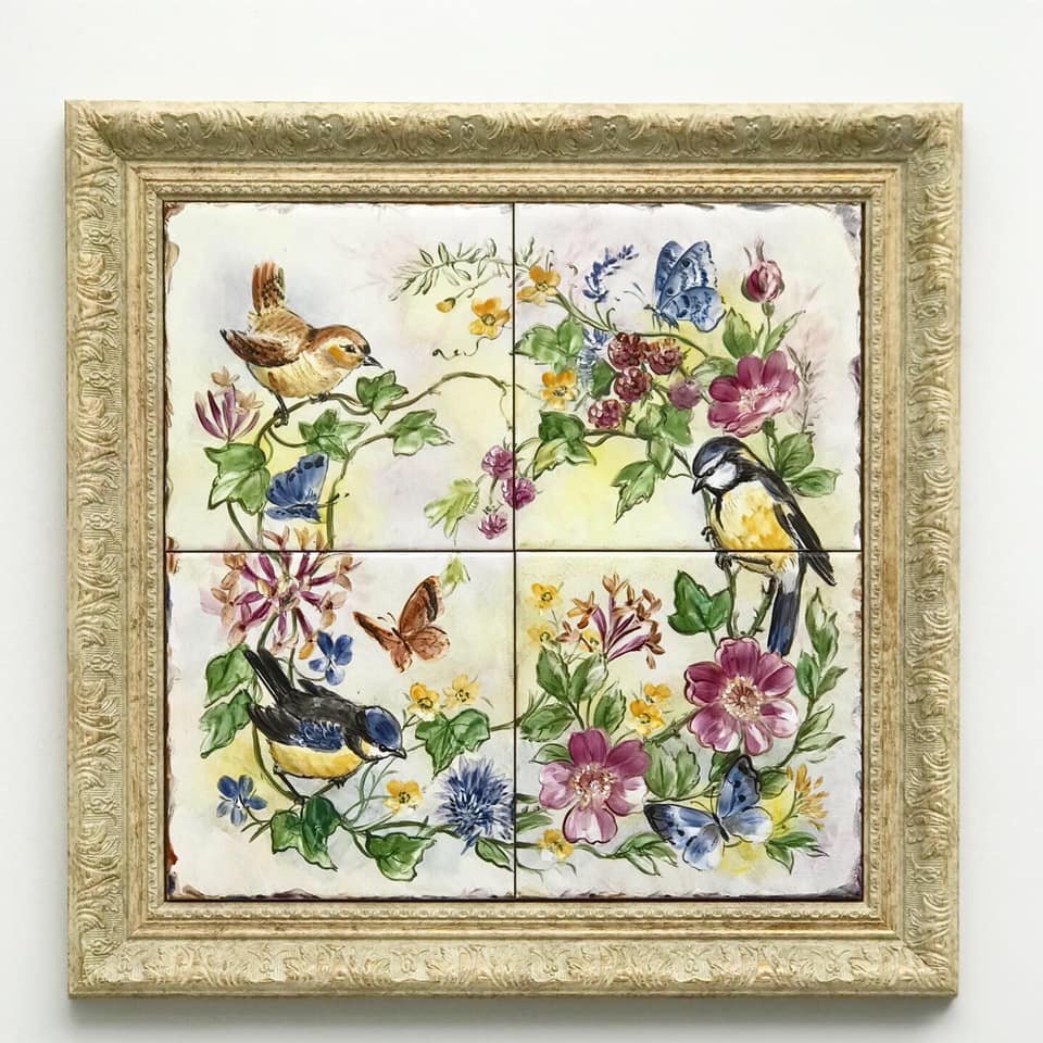 Хорошее начало года! Новое фото готовой работы в интерьере дома заказчика. Большое настенное зеркало размером 160 х 90 см и два панно 50х50 см в тему к зеркалу с птичками, выполненные в акварельной манере. Расписанная плитка дополнительно оформляется в двойной багет.