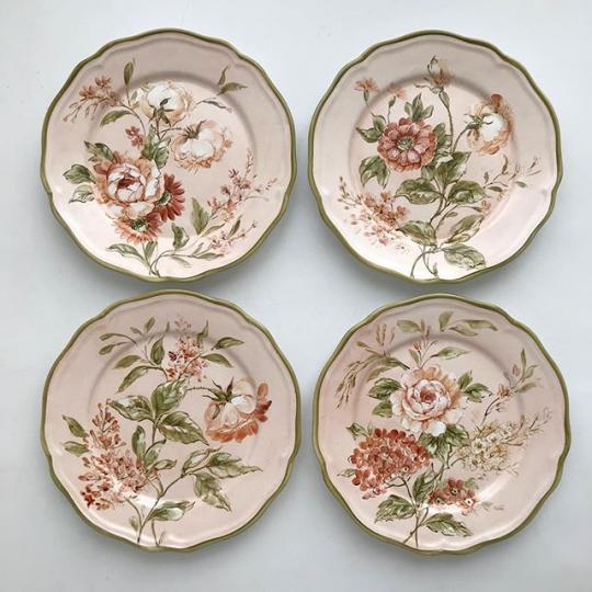 Коллекция тарелок и настенные часы на розовом фоне "Розовый лен".