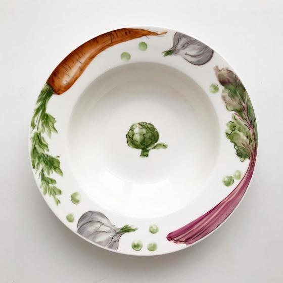 Шесть тарелок для второго блюда из большого столово-чайного сервиза «Овощи на тарелке». Авторская работа @artflera.
