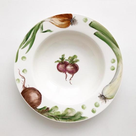 Роспись с овощами можно отнести к ботанической. Много лет назад, когда еще не было фотографии, художники-натуралисты рисовали овощи с натуры, в точности повторяя с оригинала каждый корешок, листик, оттенок цвета. Получались очень сочные живописные натюрморты- «фотографии», которые затем составляли ботанические атласы. Рисунки из таких атласов стали образцами для росписи тарелок