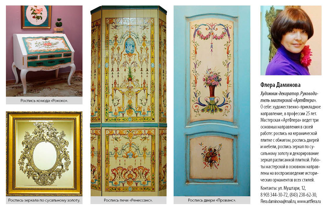 В мастерской казанской художницы Флёры Даминовой глаза просто разбегаются! Яркие узоры на керамической плитке: миниатюры и огромные полотна от потолка до пола. Зеркала, оформленные сусальным золотом и краской, отражают не тебя, усталую журналистку, а какую-то совершенно невероятную красавицу. Двери расписаны сценами охоты или гирляндами цветов.