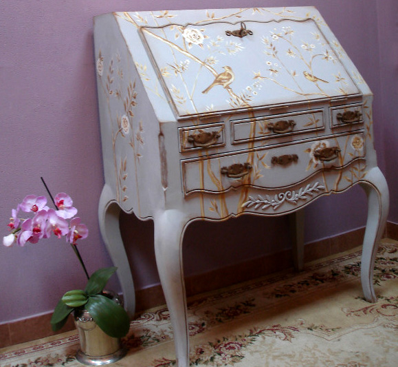Пролистывая как-то интерьерный журнал, отметила для себя фотографии европейских интерьеров, украшенными обоями с прекрасными росписями деревьев и птиц. Ну как такое можно забыть? Предложила заказчице этот вариант, она с удовольствием согласилась. И вот … началась работа. Да собственно уже закончилась. Посмотрите мой мастер-класс по росписи комода в стиле «шинуазри».