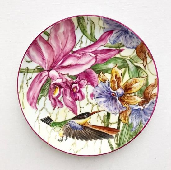Сегодня у меня немного экзотики. В центре росписи – цветущие бордовые орхидеи и райские птички колибри с радужным оттенком оперения. Очень актуальная получилась, весенняя «тропическая» тема.