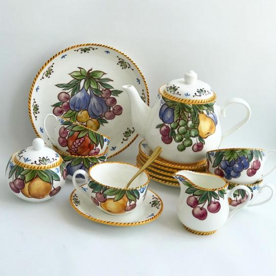 6 чайных пар ( чашка+блюдце), заварочный чайник 1.2 мл, молочник, сахарница. Новый сервиз отправлен заказчице в город Алма-ата (Казахстан).