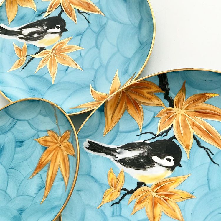 Синичка и японский клен. На фото тарелки диаметром 25, 20 и 15 см. Надглазурная роспись, декорирование 12% золотосодержащим препаратом.