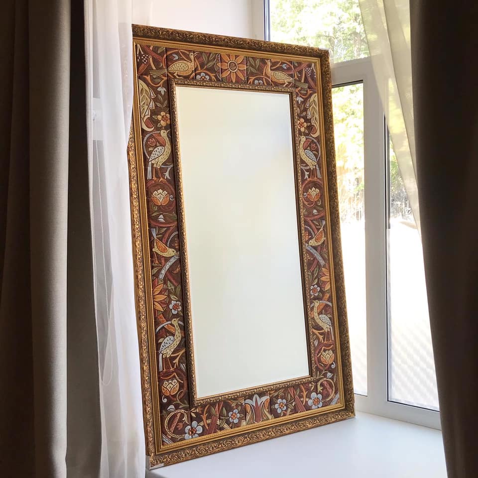 Зеркало декорировано расписанной керамической плиткой по мотивам орнамента Уильяма Морриса, легендарного художника и дизайнера конца 19 века.