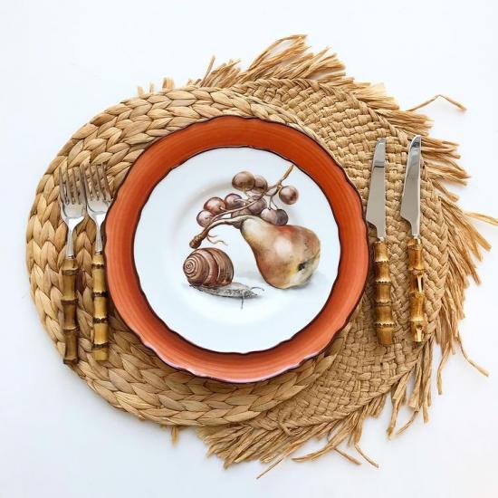 Размер тарелок 22 и 28 см. Особенность подстановочных (28 см) в широкой цветной окантовке по краю (а по центру тот же белый фарфор с рисунком по мотивам Гарцони). У каждой тарелки свой цвет. Оттенки подобраны теплые природные: оранжевый, бежевый, темно-зеленый, коричневый, серый... Теперь, сервируя стол, мы основную тарелку - размером поменьше - ставим на подставочную, и получается такая двухслойная композиция с “декоративными” цветными “кольцами”.