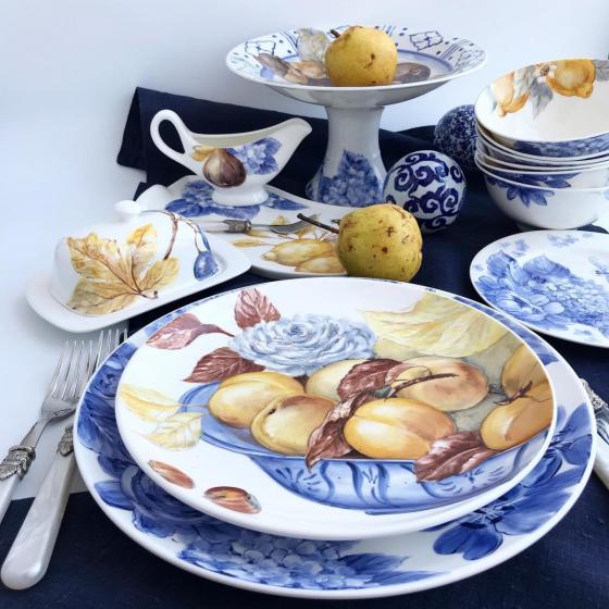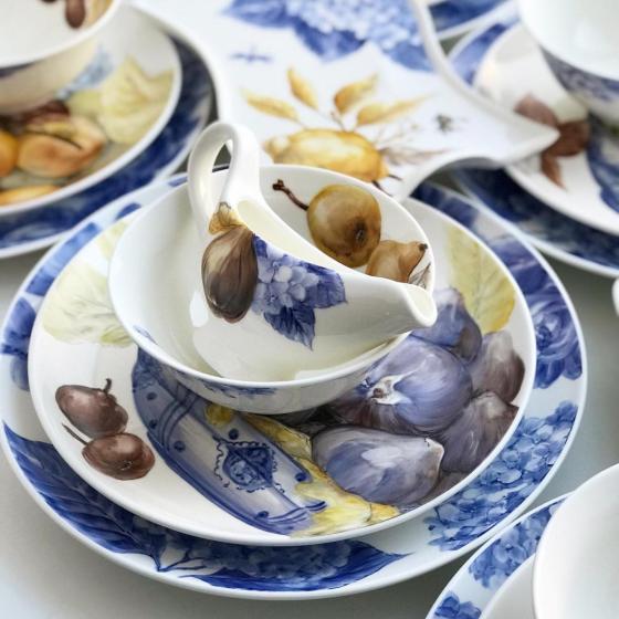 Идея росписи принадлежит моей заказчице, которая предложила объединить в одном сервизе две мои предыдущие работы: классический сине-белый сервиз с гортензиями и яркие натюрморты с живописными фруктами по мотивам картин Джованны Гарцони (итальянская художница, 16 век).