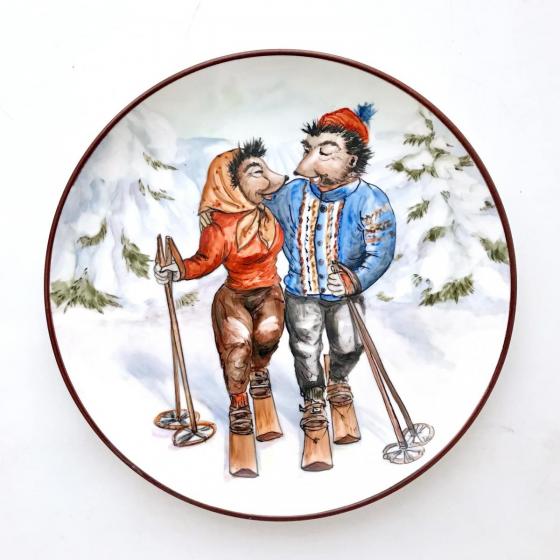 Росписи созданы по мотивам работ немецкого художника Эриха Нойберта. Знаменитая коллекция почтовых открыток "Из жизни ежей", которая выпускалась в ГДР в 50-е, 60-е и 70-е гг. Теперь подобные картинки это уже винтаж, привет из советского прошлого.