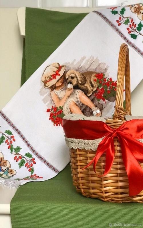Эти приятные вещицы выполняют не только декоративную функцию, но и полезны в быту. Корзина – емкость для хранения, а вышитая салфетка – дорожка-подставка на стол. Такие детали, как живописная салфетка, помогут по-новому украсить стол к приему гостей, создать праздничную сервировку.