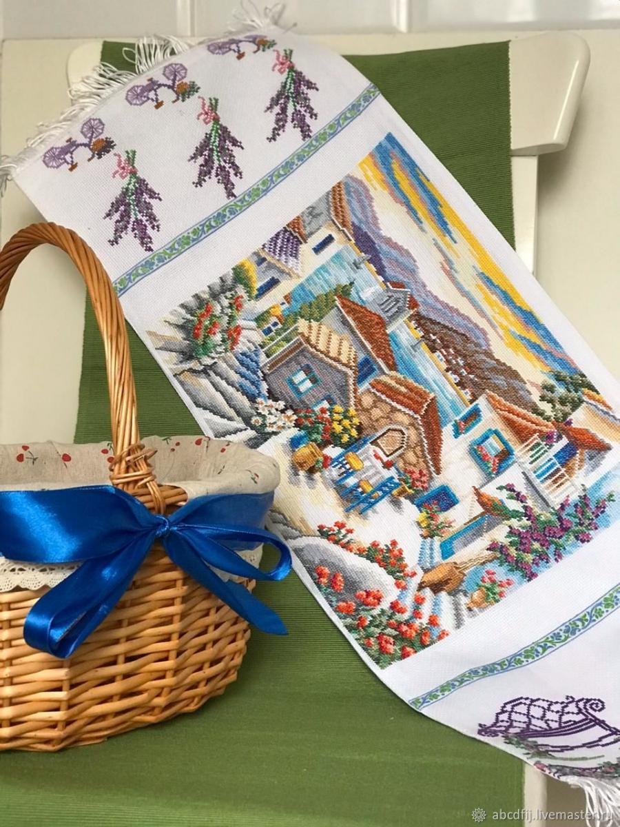 Салфетка посажена на подкладочную ткань, по краю пришита декоративная лента. Размеры корзин и салфеток могут быть разные (салфетка обычно 70*30 см). С двух сторон – вышитые сюжеты, в центре мелкий декор.