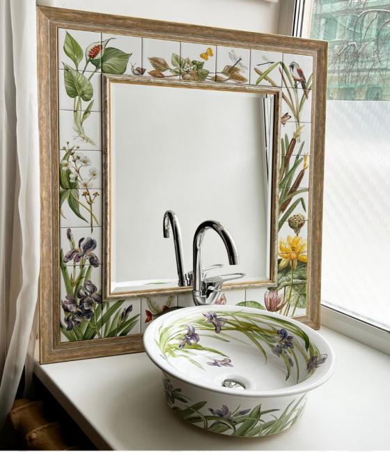 И еще одна недавняя работа на тему болотно-озерной живности. Тандем: настенное зеркало и круглая керамическая раковина для ванной комнаты. Расписано также под заказ. Доставка транспортной компанией в любой город.